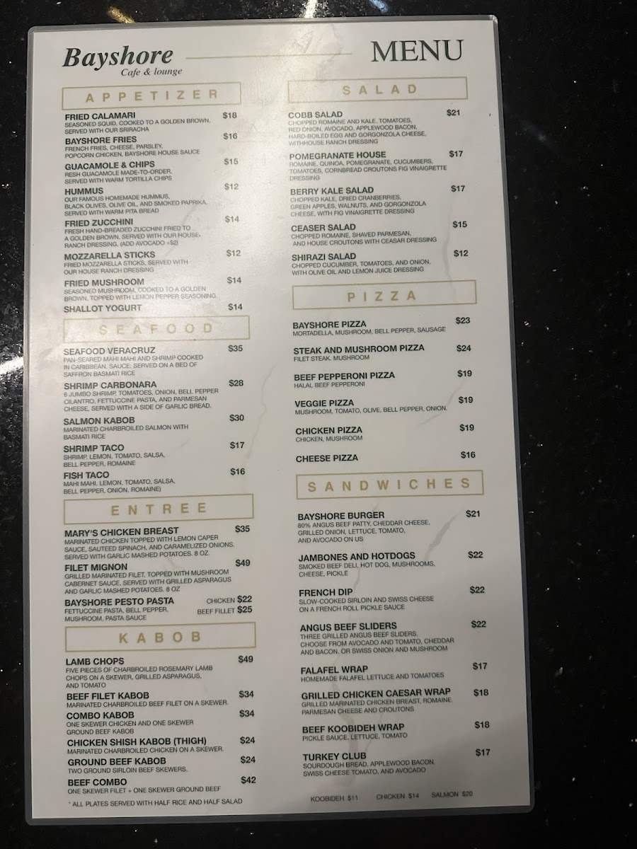 Welcome to Bayshore Cafe Lounge, a hidden gem nestled in Newport Beach, CA, where the flavors of Persian cuisine come alive. This charming cafe offers a refreshing menu that is a treat for the senses. Guests rave about their juicy beef koobideh and succulent salmon kabobs, expertly seasoned and served with fluffy saffron rice or crispy fries. The absence of seed oils adds a healthy twist to each dish, ensuring freshness without compromising on taste.